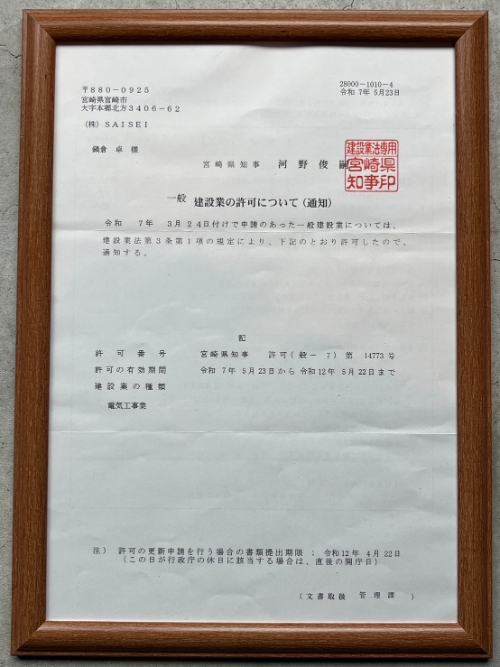 2025年5月29日 / 最終更新日時 : 2025年6月6日 saisei-r 会社関連 建設業許可取得のお知らせ 当社は2025年5月23日付で、宮崎県より建設業許可を取得いたしました。これにより、より幅広い案件への対応が可能となります。今後とも変わらぬご愛顧を賜りますようお願い申し上げます。